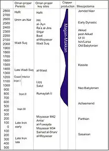 В это время достигает пика производство меди (этот уровень медного производства будет превзойдён лишь в исламский период). Хронология Омана в этот период весьма близка по своим этапам к хронологии Объединённых Арабских Эмиратов. Парадоксально, но железные артефакты указанного периода в Омане до сих пор не обнаружены. В соседнем (через пролив) Иране, напротив, железное оружие весьма широко распространено уже с 1200 г. до н. э.