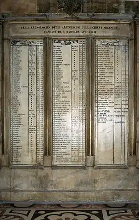 По преданию, кафедра Милана была основана святым апостолом Варнавой в 52 году. Плита с именами епископов и архиепископов Милана установлена в соборе в центральном нефе. Согласно многовековой традиции, берущей начало в позднем средневековье и признававшейся до начала XX века, некоторые из архиереев первого тысячелетия являлись членами древней фамилии правителей Милана. Четверо архиепископов были избраны Папами (Умберто Кривелли, Джованни Анджело Медичи, Акилле Ратти, Джованни Баттиста Монтини) и антипапой (Пьетро Филагро, избранный на Пизанском соборе и ныне признанный антипапой).
