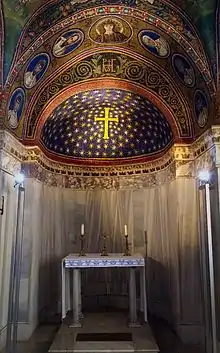 Апсида капеллы расписана темперной краской, главным изображением является крест на фоне звёздного неба. Крестовой свод украшен мозаичной монограммой Христа, которую возносят четыре ангела, между которыми помещены символы евангелистов. На распалубках свода помещены медальоны с несколькими мозаичными изображениями Христа, двенадцати апостолов и ряда святых. Академик Лазарев В. Н. отмечает их ярковыраженную индивидуальность лиц. Часто повторение изображений Христа объясняется желанием заказчика капеллы подчеркнуть установленную Никейским собором единосущную Богу Отцу божественную природу Иисуса, которую отрицали владевшие городом готы-ариане.