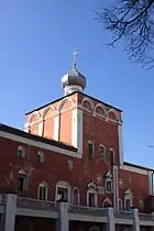 - Святые ворота. В 1687 году над Святыми воротами возведена надвратная Воздвиженская церковь (освящена в 1692 году). Она представляет собой небольшой четверик, увенчанный одной главой, поставленной над прямоугольным алтарём и узкой, сдвинутой к северу трапезной. Современное купольное покрытие и глава появились в XVIII веке.