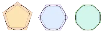 Огромное значение для развития математики имело вычисленное Архимедом отношение длины окружности к диаметру. В работе «Об измерении круга» Архимед дал своё знаменитое приближение для числа : «архимедово число» . Более того, он сумел оценить точность этого приближения: . Для доказательства он построил для круга вписанный и описанный 96-угольники и вычислил длины их сторон. Он также доказал, что площадь круга равна (числу пи), умноженному на квадрат радиуса круга ()[46][42].