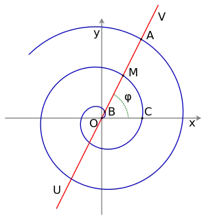 Луч OV, проведённый из начальной точки O, пересекает спираль бесконечное число раз — точки B, M, A и так далее. Расстояния между точками B и M, M и A равны шагу спирали . При раскручивании спирали расстояние от точки O до точки M стремится к бесконечности, при этом шаг спирали остаётся постоянным (конечным), то есть чем дальше от центра, тем ближе витки спирали по форме приближаются к окружности.