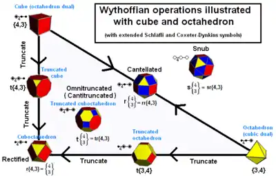 Различные архимедовы и платоновы тела могут быть получены друг из друга с помощью пригоршни операций. Начиная с платоновых тел можно использовать операцию усечения углов. Для сохранения симметрии усечение делается плоскостью, перпендикулярной прямой, соединяющей угол с центром многоугольника. В зависимости от того, насколько глубоко проводится усечение (см. таблицу ниже), получим различные платоновы и архимедовы (и другие) тела. Растяжение или скашивание осуществляется путём движения граней (в направлении) от центра (на одно и то же расстояние, чтобы сохранить симметрию) и созданием, затем, выпуклой оболочки. Расширение с поворотом осуществляется также вращением граней, это ломает прямоугольники, возникающие на местах рёбер, на треугольники. Последнее построение, которое мы здесь приводим, это усечение как углов, так и рёбер. Если игнорировать масштабирование, расширение можно также рассматривать как усечение углов и рёбер, но с определённым отношением между усечениями углов и рёбер.