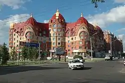 С середины 1990-х годов архитекторы города получили независимость, что немедленно отразилось в архитектуре — появилось множество помпезных и вычурных зданий в духе краснокирпичных купеческих особняков конца XIX века. Примерами могут служить: главный офис «Сбербанка», жилой дом с куполами, прозванный «Три богатыря». А также элитные жилые дома на Социалистическом проспекте, построенные в конце 90-х годов — самым первым и самым ярким является дом, расположенный по пр. Социалистический 38. Он находится в исторической части города поквартальной малоэтажной застройки. Характерной особенностью является — кирпичная кладка, где применяется орнаментация белого кирпича на фоне красного и комбинирование с красным кирпичом штукатурных фрагментов, окрашенных в серый цвет. Здание решено в классическом стиле с симметричным построением фасада и акцентированными углами, а также с трёхчастным членением по горизонтали. Средняя часть украшена портиками, имеется аттиковый этаж. Сочетание больших арочных окон и окон прямоугольной формы вносит разнообразие в решение фасада. Белые пластические детали чётко выделяются на фоне красных стен, что придаёт зданию торжественность и праздничность. Парадные входы подчёркнуты выступающими плоскостями и арками. Оси здания подчёркнуты куполами. Эта особенность заимствована как раз у характерных для модерна конца XIX столетия зданий. Центральный купол увенчан ротондой, дополняющий классическую композицию здания.