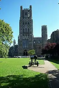 Готика Англии возникла достаточно рано — в конце XII в. и просуществовала до XVI в. Слабое развитие городов привело к тому, что готический собор стал не городским храмом, а монастырским, окружённым полями и лугами. Отсюда, очевидно, его «распластанность» по горизонтали, растянутость в ширину, наличие нескольких пристроек. Доминанта собора — огромная башня, ярусная, прямоугольная, с плоской крышей.