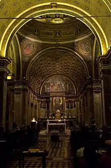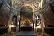 В 1512 году были открыты для обозрения фрески в Сикстинской капелле, которые считаются вершиной творчества гениального Микеланджело. (1475—1564). Микеланджело был автором неосуществленного проекта надгробия Юлия II в главном нефе собора Сан-Пьетро. Ныне условный макет гробницы с частью подлинных скульптур экспонируется в церкви Сан-Пьетро-ин-Винколи. Микеланджело спроектировал оформление площади Капитолия (1536) — один из самых выдающихся ансамблей эпохи Возрождения. Микеланджело руководил работами по строительству собора Св. Петра. Он значительно изменил план, расширив подкупольное пространство за счет усиления пилонов средокрестия и выстроил новую апсиду, сложно профилированные карнизы и наличники окон также предвещают экспрессию барокко. По проекту Микеланджело после его смерти Джакомо делла Порта возвел купол над собором, придав ему вместо изначально запланированной полусферической формы новую, параболическую, чем усилил общую экспрессию силуэта.