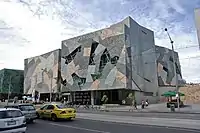 Площадь Федерации, созданная на бетонной платформе выше железнодорожных линий, занимающая площадь 3,2 га (7,9 акров), является многофункциональной постройкой, начала 2000-х гг. Здания на площади были спроектированы в стиле деконструктивизма с современными минималистическими формами. Комплекс зданий образует грубую U-образную форму вокруг главной площади под открытым небом, обращённой на Запад. Восточный конец площади представлен стеклянными стенами Атриума. В то время как для большинства покрытий у Атриума и ул. Paul’s Court использовали различные породы камней, как и для пешеходных дорожек в центре Мельбурна, главная площадь вымощена из 470 000 блоков песчаника цвета охры из Западной Австралии[54] и напоминает природу районов за городом. Мощение спроектировано Полом Картером как огромное городское произведение искусства, называемое Nearamnew, которое мягко возвышается над уровнем улицы и содержит ряд текстовых фрагментов, инкрустированных в его волнистой поверхности. Площадь также содержит большой телевизионный экран, который транслировал ряд национальных обращений, в том числе речь 2007 года премьер-министра Австралии Кевина Радда, принёсшего извинения украденному поколению коренных австралийцев. На площади расположены Австралийский центр движущегося изображения и штаб-квартира SBS. Несколько других известных сооружений и памятников расположены за пределами центра. Некоторые из них находились в прибрежных районах, таких как St Kilda, и были снесены или уничтожены в результате пожаров. Танцевальный зал Palais de Dance (1913) в St Kilda, построенный американцами Леоном и Германом Филлипсами, сгорел в 1968 году[55], Princes Court (конец 1800-х годов) — парк развлечений с водными аттракционами, был закрыт в 1909 году, морские ванны St Kilda, с двумя большими банями, были построены в 1860 году и закрыты в 1993 году. Знаменитая электростанция на Спенсер-Стрит в центре города, с большим 370-футовым дымоходом (построенным в 1952 году) и считающимся среди широкой публики «бельмом на глазу», была снесена между 2008 и 2009 годами[55].