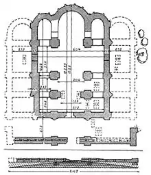 - Формально шестистолпный, но восточная пара столбов совпадает с восточной стеной