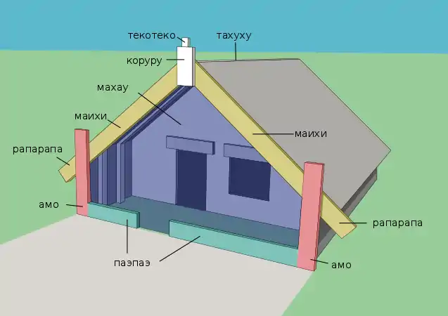 Части домов-фаре, фарепуни и фаренуи соотносили с частями тела людей (обычно предков), для их именования используются слова типа «голова», «руки», «пальцы», «рёбра» и так далее[22]. Жилые здания маори имеют следующие части[23][24][25]: