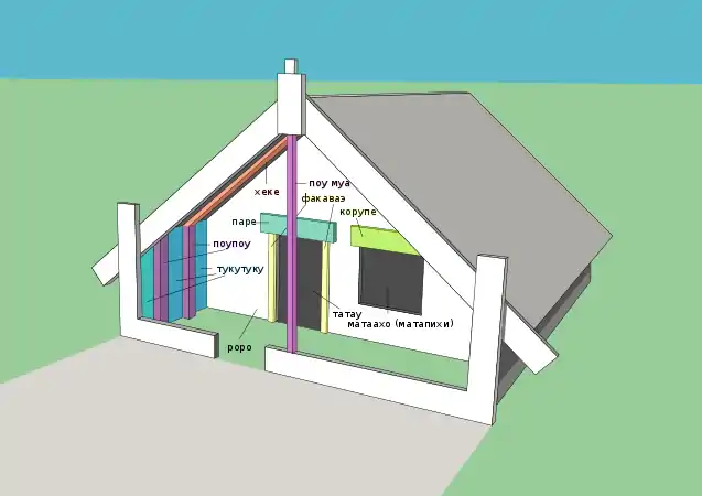 - поупоу (маори poupou) — вертикальные деревянные пилястры, часто резные,