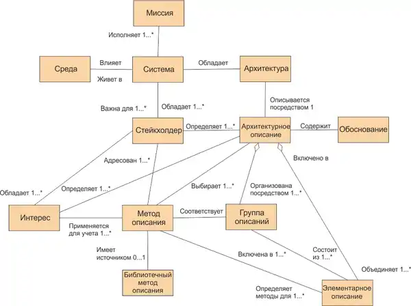 Концептуальный подход определяет термины и понятия, относящиеся к содержанию и применению АО. На рисунке изображены основные понятия и их взаимосвязи. Все понятия определены в контексте архитектуры определенной системы и соответствующего архитектурного описания. Не нужно предполагать, что у системы существует лишь одна архитектура или что эта архитектура изображается лишь одним архитектурным описанием.
