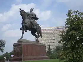 - Здание Республиканского театра оперы и балета им. Алишера Навои, построенное в 1940—1947 годах по проекту архитектора А. В. Щусева[6]. Строительство здания театра было начато на площади, где в течение долгого времени располагался Воскресенский базар[7]. Торжественное открытие театра состоялось в ноябре 1947 года, во время празднования 500-летия со дня рождения А. Навои, имя которого и было присвоено новому театру. Зрительный зал вмещает 1400 человек, площадь сцены 540 м². Шесть залов фойе, расположенных на трёх этажах по сторонам зрительного зала, посвящены шести имевшимся в составе Узбекской ССР в 1947 году областям: Ташкентской, Самаркандской, Бухарской, Термезской, Хивинской и Ферганской. Для оформления залов здания театра архитектором были приглашены мастера из каждой области. За создание театра А. В. Щусеву была присуждена Государственная премия СССР 1948 года. В начале войны строительство было заморожено и вновь возобновилось в 1943 году. Интересно, что в послевоенные годы строительство здания театра осуществлялось в основном силами японских военнопленных, находившихся в то время в Ташкенте.