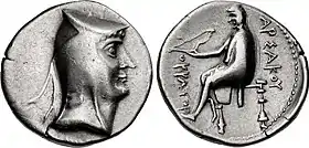 ![]() Изображение Аршака I на монете. Лицевая сторона (аверс) ранней парфянской монеты с изображением основателя Парфянского государства Аршака I, облаченного в башлык — типичный кочевнический головной убор. Самое распространенное изображение на оборотной стороне (реверсе) парфянских монет — царственный персонаж (скорее всего, обожествленный Аршак I) держит в вытянутой руке лук, являвшийся символом власти у древних ираноязычных номадов, из среды которых вышли Аршакиды. | |
