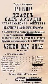 8 июня 1918 года труппа «бакинских мусульманских актёров» с участием Аббаса Мирзы Шарифзаде, Александры Оленской, Джалила Багдадбекова, поставила в астраханском летнем саду «Аркадия» оперетту «Аршин мал алан». Комедия была сыграна также 30 мая (12 июня) 1918 года в Зимнем театре города Астрахань[35]. Поставил оперетту Аббас Мирза Шарифзаде. Он же сыграл роль Султанбека[36]. Это была первая игра Шарифзаде в этой комедии[37].