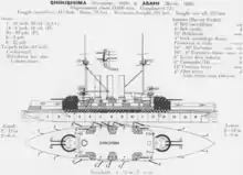 В отличие от «Сикисима» и «Хацусэ», «Асахи» (для таких же 25 котлов Бельвиля) имел не три, а две трубы и по своему силуэту сразу стал чрезвычайно походить на заложенный в марте того же года в Портсмуте (Portsmouth Dockyard) британский броненосец «Формидейбл».