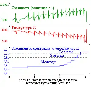 После каждой тепловой пульсации в звёздах происходит распространение конвективной зоны на бо́льшую глубину. У звёзд с начальной массой более 1,2—1,5 M⊙ она проникает достаточно глубоко, чтобы случилось третье вычерпывание, при котором на поверхность выносятся гелий, углерод и элементы, возникающие при s-процессе. В результате после какого-то числа тепловых пульсаций на поверхности звезды углерода оказывается больше, чем кислорода, и звезда становится углеродной звездой[21].