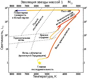 В любом случае до тех пор, пока горение гелия идёт в оболочке вокруг инертного ядра, звезда находится на так называемой ранней асимптотической ветви гигантов. Дальнейшая эволюция на асимптотической ветви гигантов проходит гораздо быстрее, а её характер зависит от массы звезды[13].