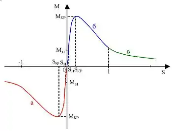Если ротор неподвижен или частота его вращения меньше синхронной, то вращающееся магнитное поле пересекает проводники обмотки ротора и индуцирует в них ЭДС, под действием которой в обмотке ротора возникает ток. На проводники с током этой обмотки (а точнее, на зубцы сердечника ротора), действуют электромагнитные силы; их суммарное усилие образует электромагнитный вращающий момент, увлекающий ротор вслед за магнитным полем. Если этот момент достаточен для преодоления сил трения, ротор приходит во вращение, и его установившаяся частота вращения [об/мин] соответствует равенству электромагнитного момента тормозному, создаваемого нагрузкой на валу, силами трения в подшипниках, вентиляцией и т. д. Частота вращения ротора не может достигнуть частоты вращения магнитного поля, так как в этом случае угловая скорость вращения магнитного поля относительно обмотки ротора станет равной нулю, магнитное поле перестанет индуцировать в обмотке ротора ЭДС и, в свою очередь, создавать вращающий момент; таким образом, для двигательного режима работы асинхронной машины справедливо неравенство: