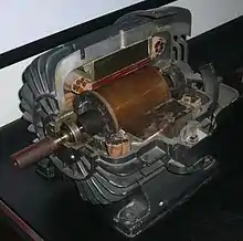В 1888 году Галилео Феррарис опубликовал свои исследования в статье для Королевской академии наук в Турине (в том же году Тесла получил патент США[4]), в которой изложил теоретические основы асинхронного двигателя[5]. Заслуга Феррариса в том, что, сделав ошибочный вывод о небольшом КПД асинхронного двигателя и о нецелесообразности применения систем переменного тока, он привлек внимание многих инженеров к проблеме совершенствования асинхронных машин. Статья Галилео Феррариса, опубликованная в журнале «Атти ди Турино», была перепечатана английским журналом и в июле 1888 года попала на глаза выпускнику Дармштадтского высшего технического училища, выходцу из Российской Империи Михаилу Осиповичу Доливо-Добровольскому. Уже в 1889 году Доливо-Добровольский получил патент на трехфазный асинхронный двигатель с короткозамкнутым ротором типа «беличье колесо» (германский патент № 51083 от 8 марта 1889 года под названием «Anker für Wechselstrommotoren»), а в 1890-м — патенты в Англии № 20425 и Германии № 75361 на фазный ротор с кольцами и пусковыми устройствами. Данные изобретения открыли эру массового промышленного применения электрических машин. В 1903 году в Новороссийске построен элеватор с первой в мире промышленной сетью переменного трехфазного тока, все установки которой изготовлены под руководством Доливо-Добровольского. На данном элеваторе, также впервые в мире, применены трехфазные трансформаторы и асинхронные двигатели с фазным ротором. В настоящее время асинхронный двигатель Доливо-Добровольского является самым распространенным электродвигателем.