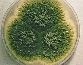 Колонии на агаре Чапека с дрожжевым экстрактом (CYA) 5—7 см в диаметре на 7-е сутки, бархатистые, с обильным спороношением по всей поверхности в тёмно-жёлто-зелёных тонах. Иногда образует склероции — беловатые, затем чёрные, иногда покрывающие почти всю колонию (тогда конидиальное спороношение слабовыраженное), шаровидные, 400—800 мкм в диаметре. Реверс неокрашенный или коричневый. При 37° C колонии очень широкорастущие, сходные с колониями, образующимися при 25 °C, с более насыщенно-зелёным или коричневатым спороношением. На агаре с солодовым экстрактом (MEA) колонии 5—6,5 см в диаметре на 7-е сутки, обычно менее густые, чем на CYA.