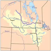 Река Ассинибойн течёт с юго-востока Саскачевана и впадает в Ред-Ривер в Виннипеге, столице Манитобы.
