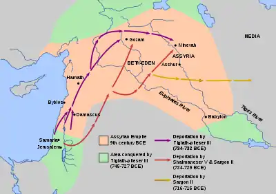 ![]() Депортации древних евреев в ассирийский плен первыми царями «новоассирийской» династии (Тиглатпаласар III, Салманасар V и Саргон II). Последняя треть VIII в. до н. э. |