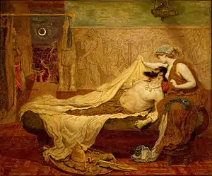 ![]() «Сон Сарданапала» художника Форда Мэдокса Брауна (1871). Художественный музей Делавэра. В образе Сарданапала античные легенды спрессовали реальных царей. Ашшурбанапала, его деда Синаххериба и трагически погибших сына Син-шар-ишкуна и брата Шамаш-шум-укина |