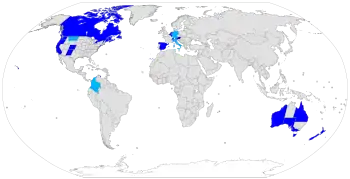 Ассистированный врачом суицид при определенных обстоятельствах легален в некоторых странах, включая Австрию,[63][64] Бельгию,[65] Канаду,[66] Люксембург,[67] Нидерланды,[68] Новую Зеландию,[69] Испанию,[70] Швейцарию[71] и некоторые части США (Калифорния,[72] Колорадо,[73] Гавайи,[74] Мэн,[75] Монтана,[76] Нью-Джерси,[77] Нью-Мексико,[78] Орегон,[79] Вермонт,[80] Вашингтон[81] и Вашингтон, округ Колумбия[82]) и Австралии (Квинсленд[83], Южная Австралия,[84] Тасмания,[85] Виктория[86] и Западная Австралия[87]). Конституционные суды Колумбии,[88][89] Германии[90] и Италии[91] легализовали ассистированный суицид, но правительства этих стран пока не приняли законодательных или регулирующих актов.