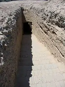 Гробницы состоят из наклонных проходов, ведущих вниз на 4 или 5 м к каменному входу, шириной около метра и высотой более метра. Затем ступенька ведет в кирпичную камеру, квадратную или продолговатую, шириной от двух до четырёх метров, длиной от трёх до четырёх метров и высотой до двух метров. Некоторые гробницы включают одну или две узкие прихожие, в которых с обеих сторон есть ниши для животных-хранителей. Эти фигуры имеют различные черты животных, а у некоторых человеческие лица. По своему изобилию они напоминают глиняные статуи Царей-Хранителей, также найденных у входов в буддийские храмы.