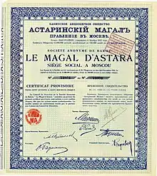 Временное свидетельство на предъявителя на сто акций по сто рублей каждая Бакинского акционерного общества «Астаринский Магал» с основным капиталом в 15 млн руб. Москва, 1916 г.