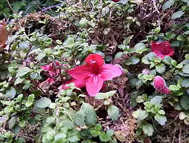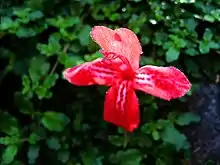 Многолетний кустарник, наземный или эпифит. Стебли гибкие, ветвящиеся, ползучие или лазающие, укореняющиеся в узлах, 30-40 см длиной. Листья супротивные, мелкие, короткочерешковые, пластинка эллиптическая, перепончато-кожистая, с тупой вершиной, адаксиальная сторона волосистая, тёмно-зелёная,[2] абаксиальная сторона голая, беловатого цвета. Цветоносы опушённые, с двумя прицветниками в основании.[2] Цветки пазушные, одиночные или по 2-3,[2] прямостоячие; прицветники небольшие, ланцетные, прикреплены под чашечкой. Чашелистики почти свободные, узко треугольные, зубчатые. Венчик воронковидно-шлемовидный, красный с беловатыми штрихами на трубке, трубка слегка сужена к основанию и постепенно расширяется к отгибу, отгиб выражено двугубый; адаксиальная губа шлемовидная, из 2 сросшихся лопастей, выступающая вперёд, абаксиальная 3-лопастная с широко распростёртыми пятнистыми яйцевидными лопастями. тычинок 4; прижаты к верхней губе отгиба, нити прикреплены выше основания трубки венчика, 3-5 см длиной; пыльники сердцевидные; есть стаминодии. Нектарник в виде кольца, у основания завязи. Завязь яйцевидно-удлинённая, 2-гнёздная, столбик тонкий, длинный; рыльце чёрное,[2] небольшое, стоматоморфное. Плод мясистая ягода, с сохраняющимся пестиком, 1-1,3 см в диаметре.[2] Семена многочисленные.[2]