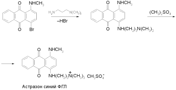 Астразон синий ФГЛ получают из 4-бром-1-метиламиноантрахинона взаимодействием с 1-амино-3-диметиламинопропаном и последующей обработкой образующегося промежуточного продукта диметилсульфатом: