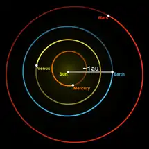 ![]() Схематическое изображение орбит планет земной группы: белым отрезком обозначена дистанция от Солнца до Земли, соответствующая 1 астрономической единице | |