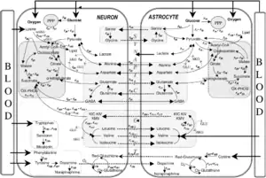 - Основным фактором выделения этих веществ служит поглощение глутамата из синаптической щели. Глутамат может быть доставлен к астроцитам специальными переносчиками глутамата, он также может воздействовать на метаботропные рецепторы астроцитов. Воздействие на рецепторы астроцитов приводит к повышению в них концентрации ионов кальция Са2+, что впоследствии приводит к выделению вазоактивных веществ COX1. Механизм регуляции диаметра сосудов при транспорте глутамата переносчиками глутамата пока неизвестен.