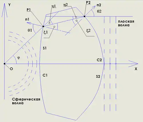 При оптимизации формы двухсторонней цельной асферической линзы, образованной поверхностями вращения из изотропного оптического материала с показателем преломления большим чем окружающая линзу однородная среда, возникает требование оптимизации: Угол θ1 падения света в каждой точке проксимальной к точечному источнику поверхности равен углу θ2 выхода того же луча (прошедшего через преломляющий материал цельной линзы) из дистальной к точечному источнику поверхности. В таком случае для каждого тонкого плоскопараллельного пучка света, условно прошедшего через точечный источник света будут выполняться также условия (см. Схему):