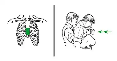 Если пострадавший не может кашлять, используйте эти две маневры вручную[2] (см. оба рисунка ниже).
