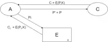На рис.1 приведена схема атаки на основе подобранного открытого текста. Атакующий (A) получает шифротекст от пользователя (С). Задача атакующего — «угадать» открытый текст . Так как атакующий имеет доступ к блоку шифрования , он имеет возможность зашифровывать свои сообщения и анализировать полученные шифротексты. . В итоге, атакующий подбирает сообщение и пересылает его пользователю.