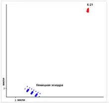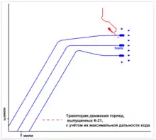 В 18.00 в Ш=71°25’N Д=23°40’ost атаковал корабли противника в составе линкоров «Тирпиц», «Шеер» и восьми миноносцев, шедший курсом на Норд-Ост. Вышел в атаку на ЛК «Тирпиц». Слышал два взрыва. Командир «К-21»