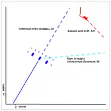 Начиная с 17:02, подводная лодка отклоняется влево, что уводит её с курса немецких кораблей. В 17:23 Лунин примерно определяет состав эскадры противника, по его мнению она состоит из линкора «Тирпиц», тяжёлого крейсера «Адмирал Шеер» и восьми миноносцев, также он обнаружил курсирующий над эскадрой гидросамолёт Ar 196; тяжёлый крейсер «Адмирал Хиппер» так и не был обнаружен и идентифицирован до конца атаки. При этом курс немецкой эскадры в вахтенном журнале К-21 указан с большой ошибкой, вместо истинного курса 30° (северо-северо-восточного) он указан как курс 85° (восточный). Столь грубая ошибка в определении курса опытным командиром в условиях отличной видимости труднообъяснима; в реконструкции сделан вывод, что наиболее вероятна не ошибка, а сознательное искажение фактов Луниным с целью представления своих действий в более благоприятном свете перед вышестоящим командованием[21].