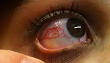 - У большинства людей развивается телеангиэктазия (видны кровеносные сосуды) в мембране[7], покрывающей белую часть (склеру) глаза. Зрение (способность чётко видеть объекты) при этом вполне нормально[16].