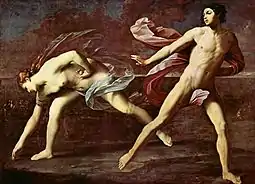 | Мелеагр, сидящий с двумя копьями, и Аталанта отдыхают после калидонской охоты на вепря. Античная фреска из Помпеи | |