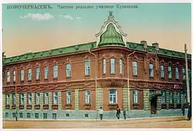 | 41 | ![]() | Школа № 5. До революции здесь находилось реальное училище Кузнецова. Потом тут разместился Донской землеустроительно-мелиоративный техникум (ныне аграрный). В 1935 году техникум перевели в здание бывшей школы Общества торговых казаков, а это отдали общеобразовательной школе. Исторический облик сохранён отчасти. К первоначально двухэтажному зданию в стиле эклектика был добавлен ещё один этаж, лишённый каких-либо архитектурных излишеств. В результате оказалась утрачена мансардная крыша с куполом[5]. |