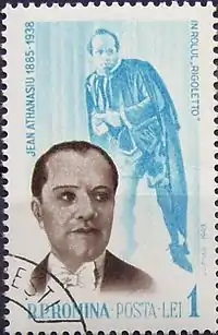 Почтовая марка Румынии с изображением Жана Атанасиу и его в роли Риголетто (1964)