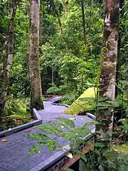 - Тропический лес расположен на границе плато и прибрежной зоны. Здесь можно встретить очень необычные растения, например невероятно огромные деревья. К ним сделаны специальные подъезды для туристов, которые стараются сфотографироваться рядом с этими великанами. Одни из самых известных это Дерево-«собор» (англ. Cathedral Fig Tree) и Баньян-«занавес» (англ. Curtain Fig Tree). На сопроводительной табличке, рядом с Баньяном-«занавес», рассказывается 500-летняя история дерева, начиная с момента его рождения.