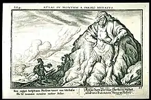 Персей прибыл к Атланту безо всякой цели грабежа. Он попросил у него лишь гостеприимства и возможности отдохнуть. Атлант, помня о пророчестве пифии, с угрозами потребовал от незваного гостя уходить. Персей, видя, что он значительно уступает великану в силе, достал голову убитой Медузы Горгоны и показал Атланту. От этого тот окаменел, волосы с бородой превратились в леса, плечи и руки в горный хребет Атласских гор, а голова стала горной вершиной, на которой «с бездной созвездий своих на нём упокоилось небо»[16][17][18][10].