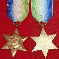 - Одна из следующих наград: Тихоокеанская звезда или Бирманская звезда. В случае, если солдат уже был награждён одной из этих медалей, ему могла быть вручена бронзовая планка для ношения на ленте, полученной в первую очередь звезды[13][14].