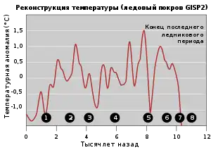 Крайне сложно определить границу окончания периода в привязке только к критерию ледяной коры, поскольку измерения всё ещё дают слишком большой разброс показателей, и согласование данных от различных исследователей ещё не завершено. Многие считают, что значительное падение температуры наступило после 4800 г. до н. э.