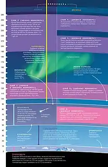 Верхний предел — около 800 км. Температура растёт до высот 200—300 км, где достигает значений порядка 1500 К, после чего остаётся почти постоянной до больших высот. Под действием солнечной радиации и космического излучения происходит ионизация воздуха («полярные сияния») — основные области ионосферы лежат внутри термосферы. На высотах свыше 300 км преобладает атомарный кислород. Верхний предел термосферы в значительной степени определяется текущей активностью Солнца. В периоды низкой активности — например, в 2008—2009 годах — происходит заметное уменьшение размеров этого слоя[11].
