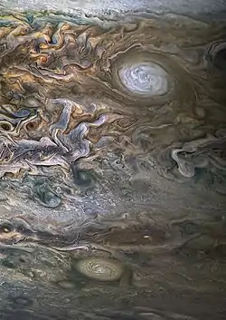 Атмосфера Юпитера — «родной дом» для сотен вихрей: круглых вращающихся структур, которые, как и в земной атмосфере, можно разделить на 2 класса: циклоны и антициклоны[6]. Первые вращаются в направлении вращения планеты (против часовой стрелки в северном и по часовой в южном полушарии); вторые — в обратном направлении. Однако, в отличие от земной атмосферы, в атмосфере Юпитера антициклоны преобладают над циклонами: из вихрей, диаметр которых превышает 2000 км, более чем 90 % — антициклоны[65]. «Срок жизни» вихрей варьируется от нескольких дней до столетий, в зависимости от их размеров: например, среднее время жизни антициклонов с диаметрами от 1000 до 6000 км — 1—3 года[66]. Вихри никогда не наблюдались на экваторе Юпитера (в пределах 10° широты), где они нестабильны[9]. Как и на любой быстро вращающейся планете, антициклоны Юпитера — центры высокого давления, тогда как циклоны — центры низкого давления[36].