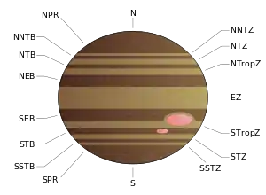 Видимая поверхность Юпитера делится на множество полос параллельных экватору. Есть два типа полос: относительно светлые зоны и затемнённые пояса[4]. Широкая экваториальная зона (EZ) простирается примерно между широтами 7°S и 7°N. Выше и ниже EZ — Северные и Южные экваториальные пояса (NEB и SEB), простирающиеся до 18°N и 18°S соответственно. Дальше от экватора лежат Северные и Южные тропические зоны (NtrZ и STrZ)[4]. Такое неизменное чередование поясов и зон продолжается до 50°S и N, где их видимые проявления становятся несколько менее заметными[30]. Пояса вероятно продолжаются примерно до 80° на север или юг по направлению к полюсам[4].